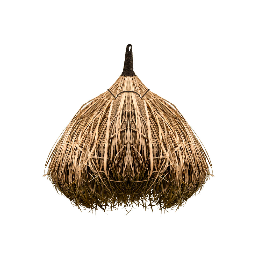 La Lámpara Mega está elaborada en hierba marina natural, ofreciendo un diseño artesanal y cálido para interiores o terrazas techadas. No apta para intemperie.