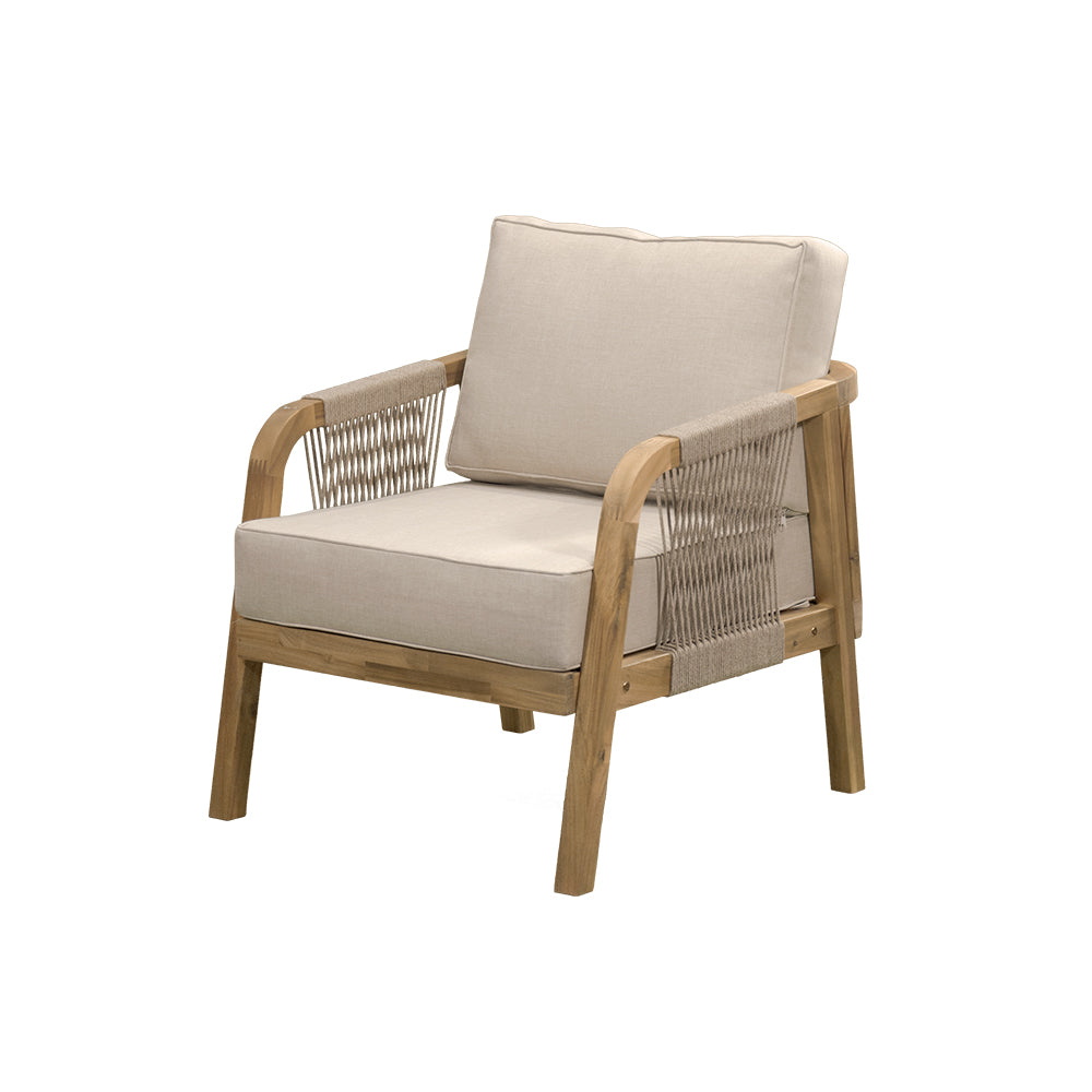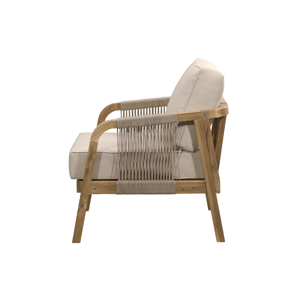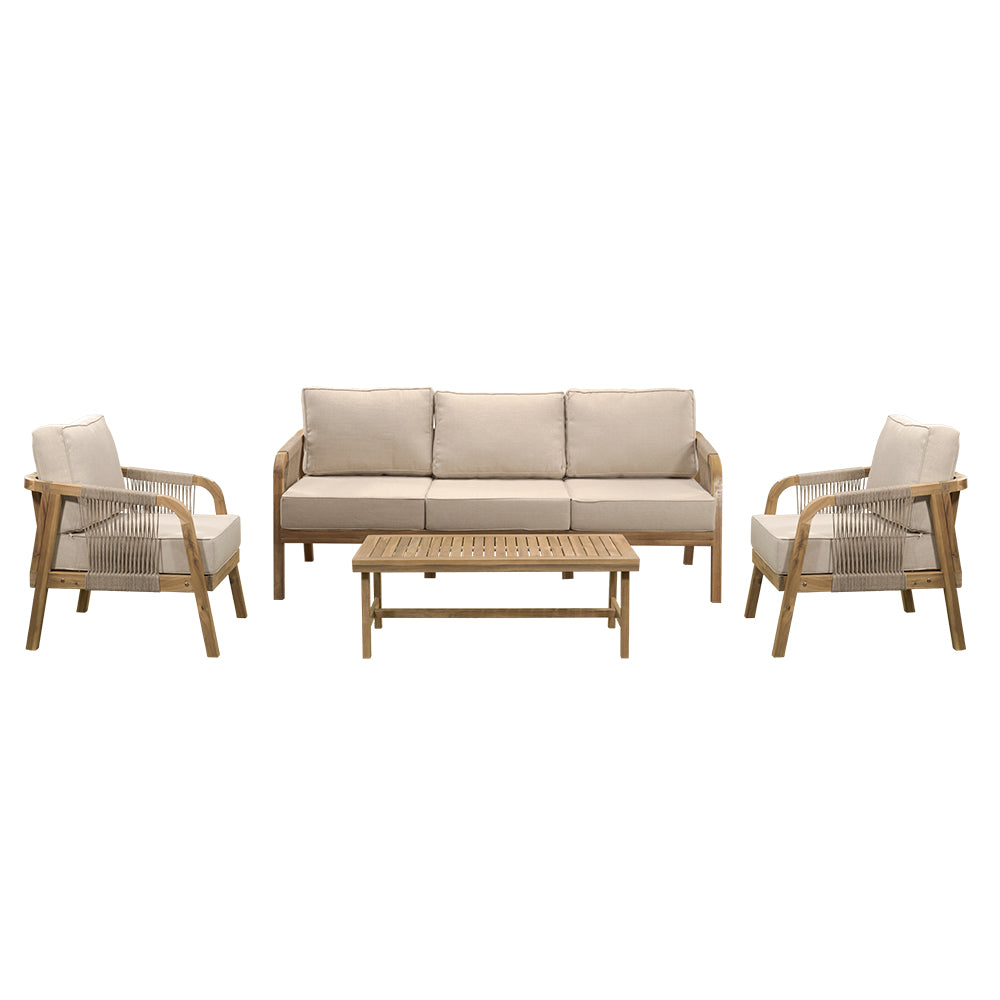 Elegancia y confort para terrazas. La Sala Camila combina estructura de madera de acacia en tono natural con tejido de cuerda y cojinería en beige, creando un ambiente cálido y sofisticado. Conformada por 4 piezas —dos sillones individuales, un sofá y una mesa de centro— es ideal para espacios exteriores cubiertos que buscan estilo y funcionalidad.