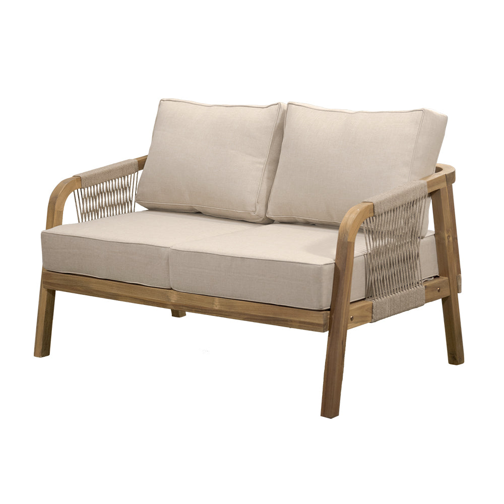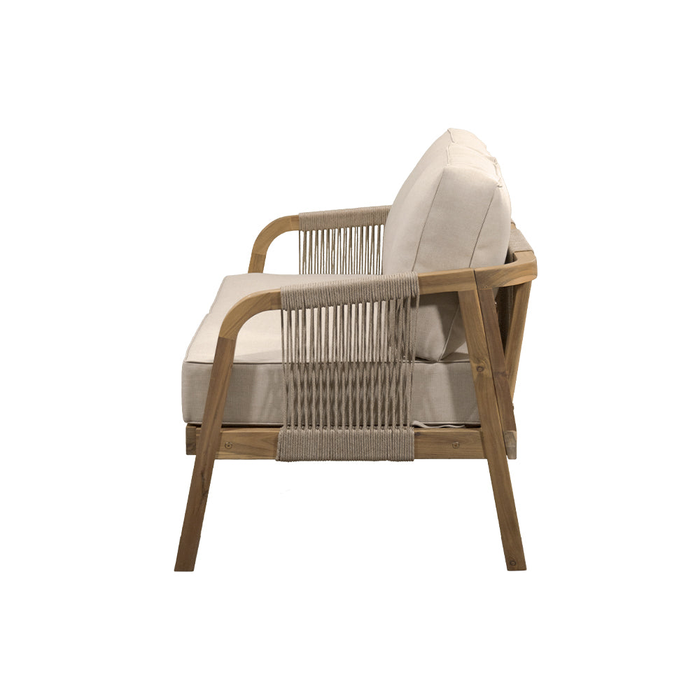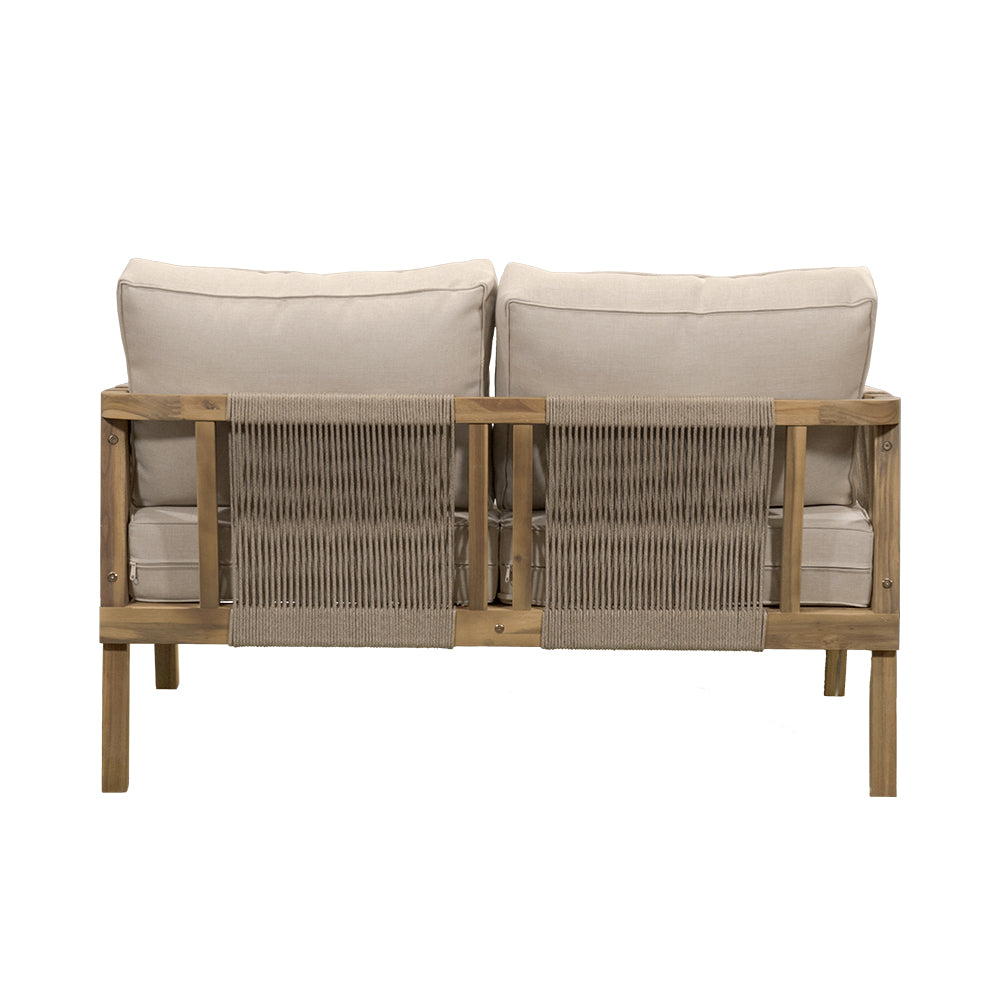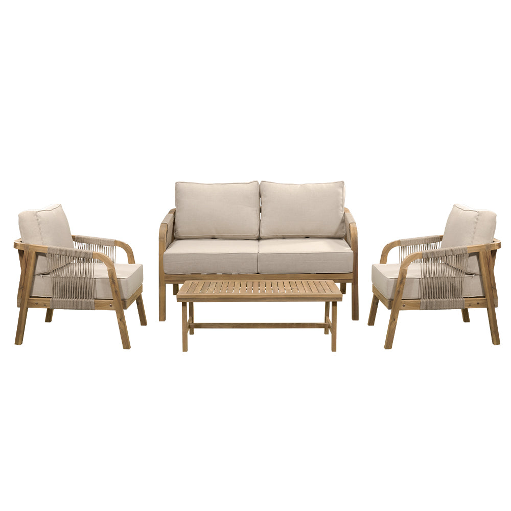 Comodidad y estilo natural para terrazas. La Sala Emilia combina estructura de madera de acacia en tono natural con tejido de cuerda y cojinería en beige, ofreciendo un ambiente acogedor y elegante. Conformada por 4 piezas —dos sillones individuales, un love seat y una mesa de centro— es ideal para crear espacios de reunión y relajación en exteriores cubiertos.
