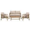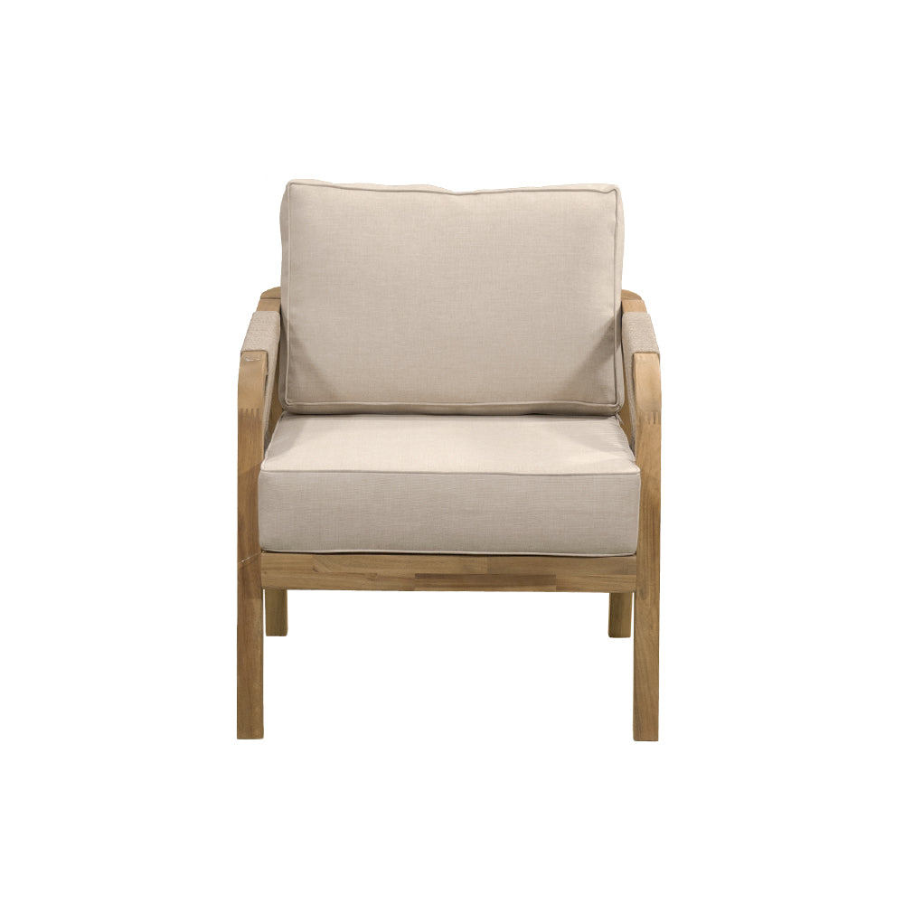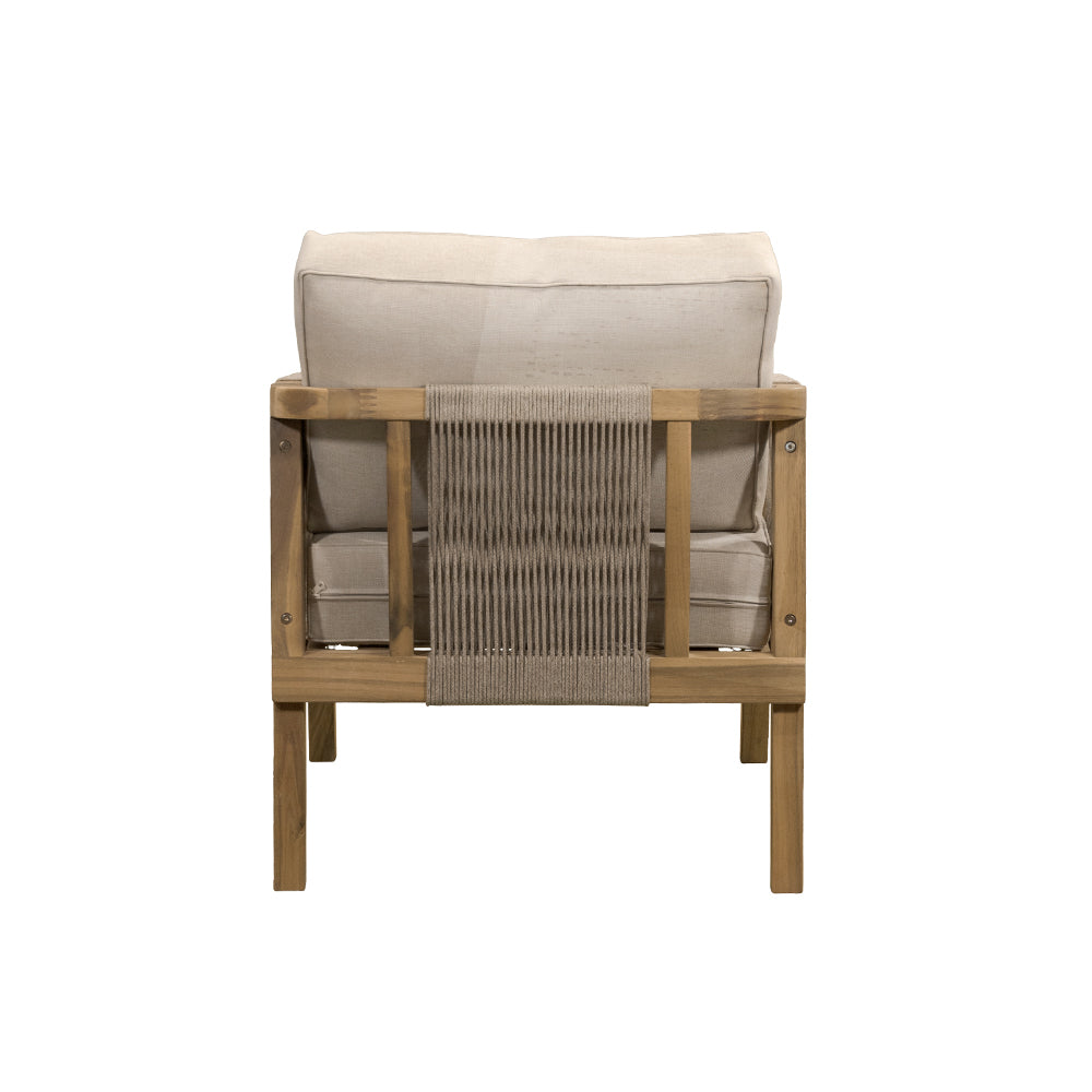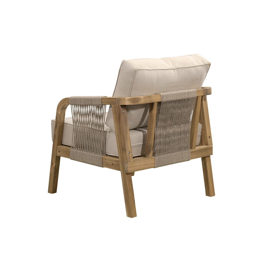 Comodidad y estilo natural para terrazas. La Sala Emilia combina estructura de madera de acacia en tono natural con tejido de cuerda y cojinería en beige, ofreciendo un ambiente acogedor y elegante. Conformada por 4 piezas —dos sillones individuales, un love seat y una mesa de centro— es ideal para crear espacios de reunión y relajación en exteriores cubiertos.