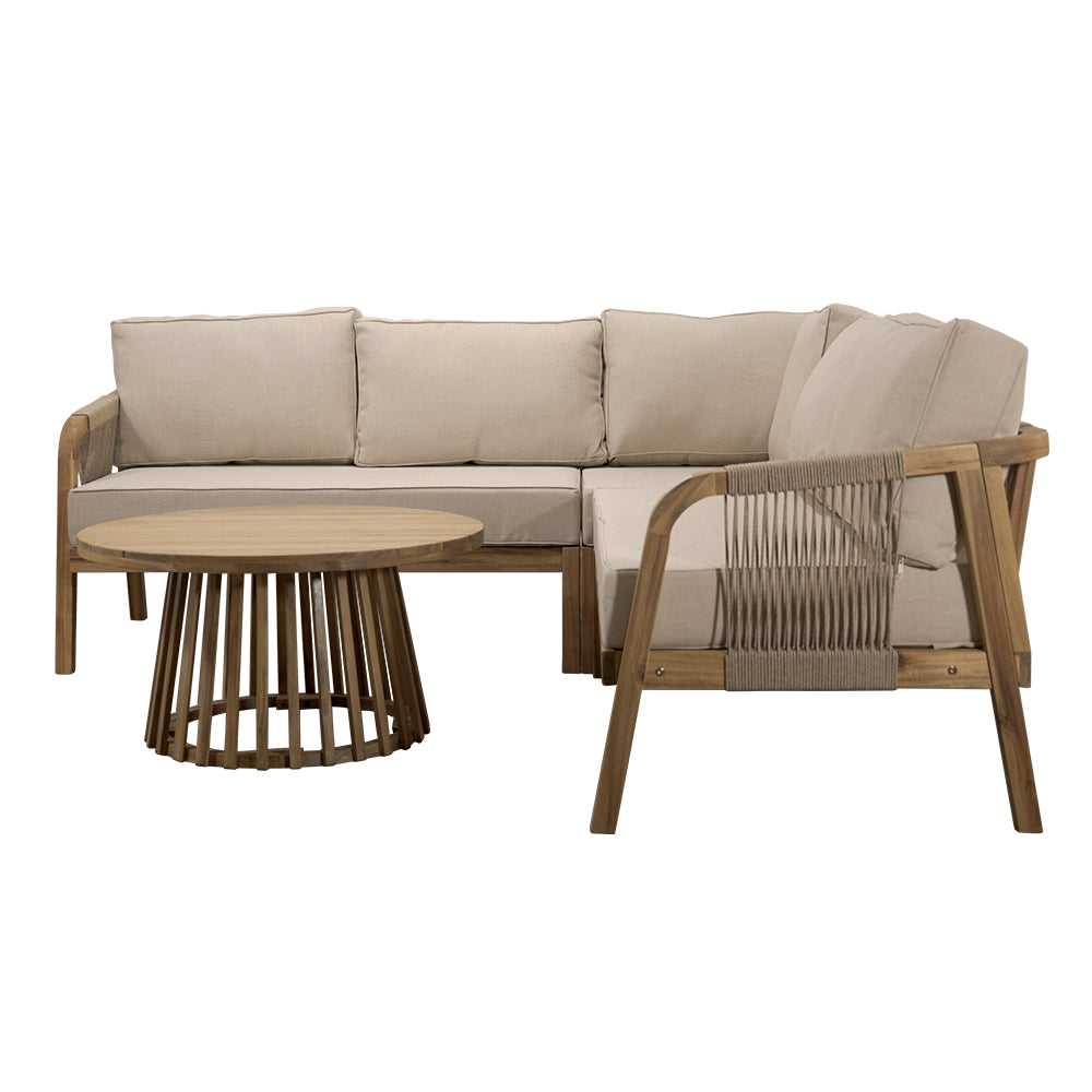 Diseño cálido y funcional para terrazas. La Sala Isabela está fabricada en madera de acacia natural con detalles en cuerda y cojinería en color beige, logrando un estilo armónico y contemporáneo. Su composición de 4 piezas —tres sillones que forman una “L” y una mesa de centro— la convierte en una opción ideal para crear ambientes acogedores y sofisticados en exteriores.