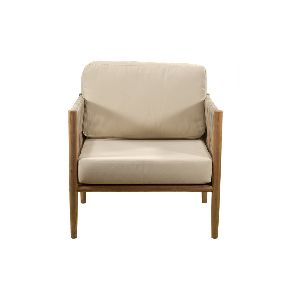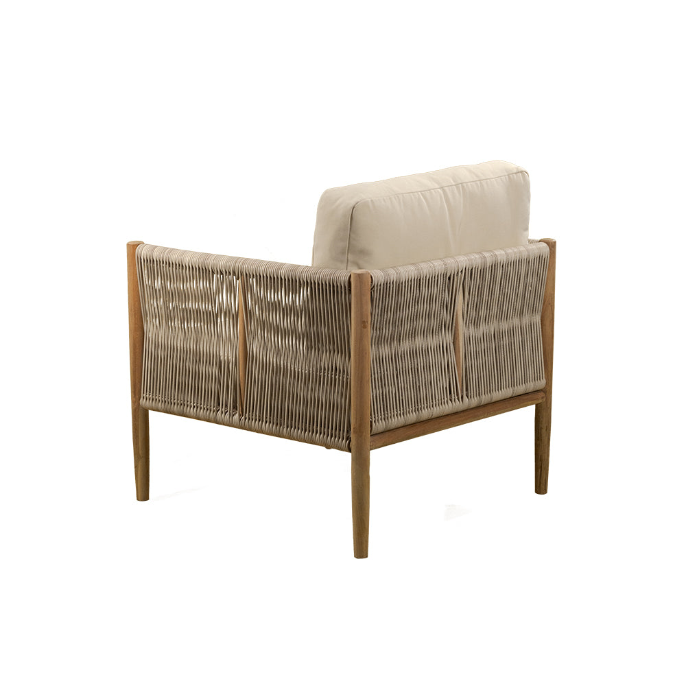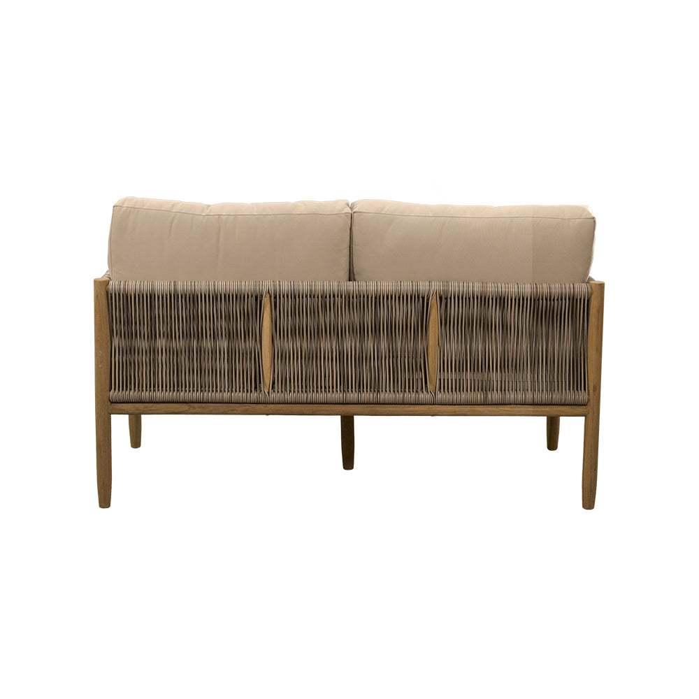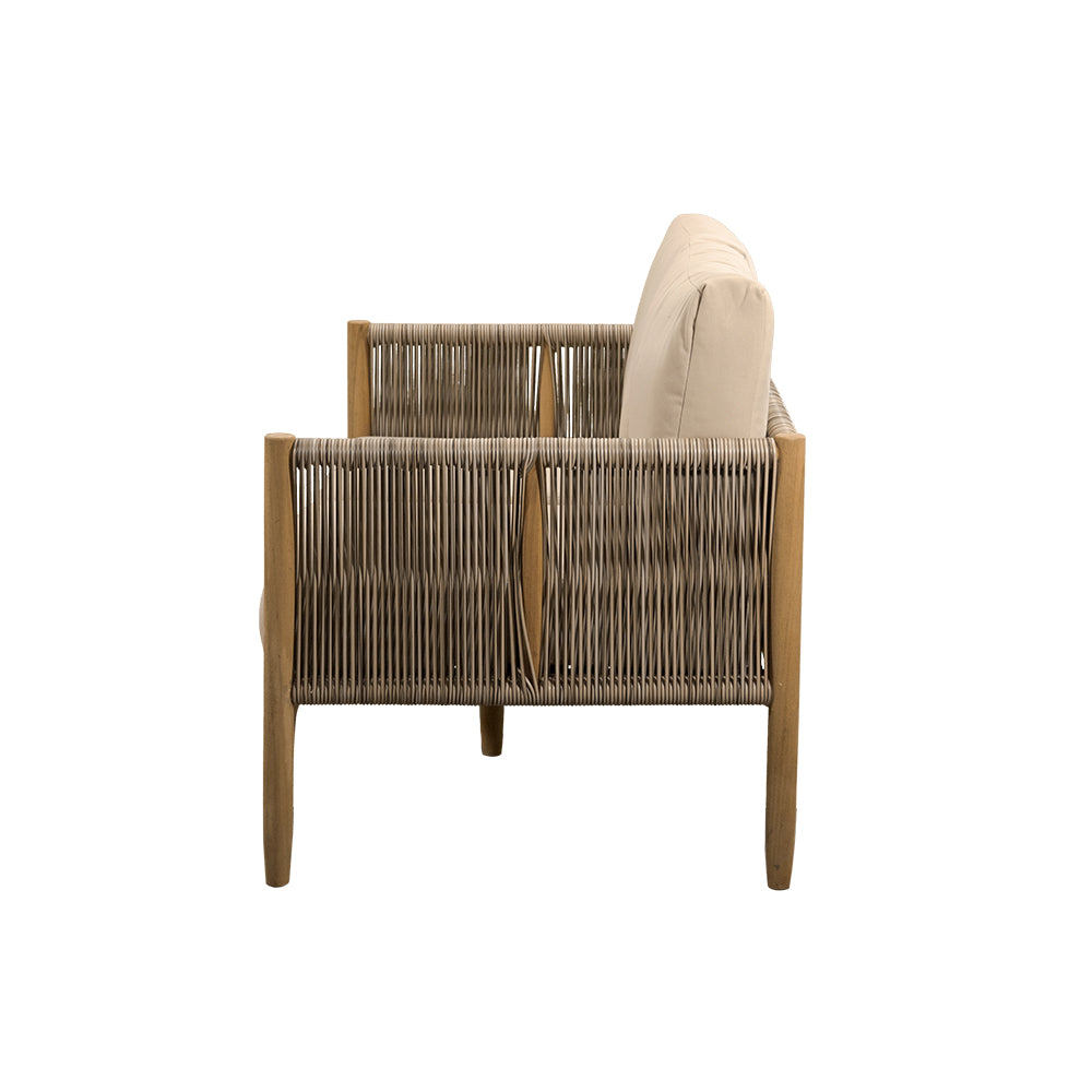 La Sala Livy es un conjunto de 3 piezas compuesto por un love seat y dos sillones individuales, diseñados en teca con tejido de polyrattan en color banana. Ideal para uso en terraza, aporta calidez, confort y un estilo natural que se adapta tanto a espacios residenciales como a proyectos hoteleros que buscan mobiliario con personalidad y durabilidad.