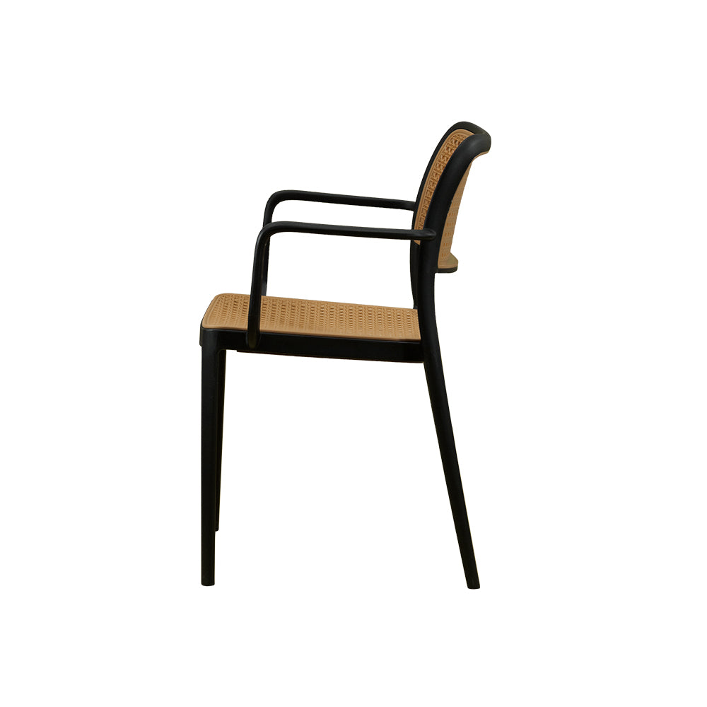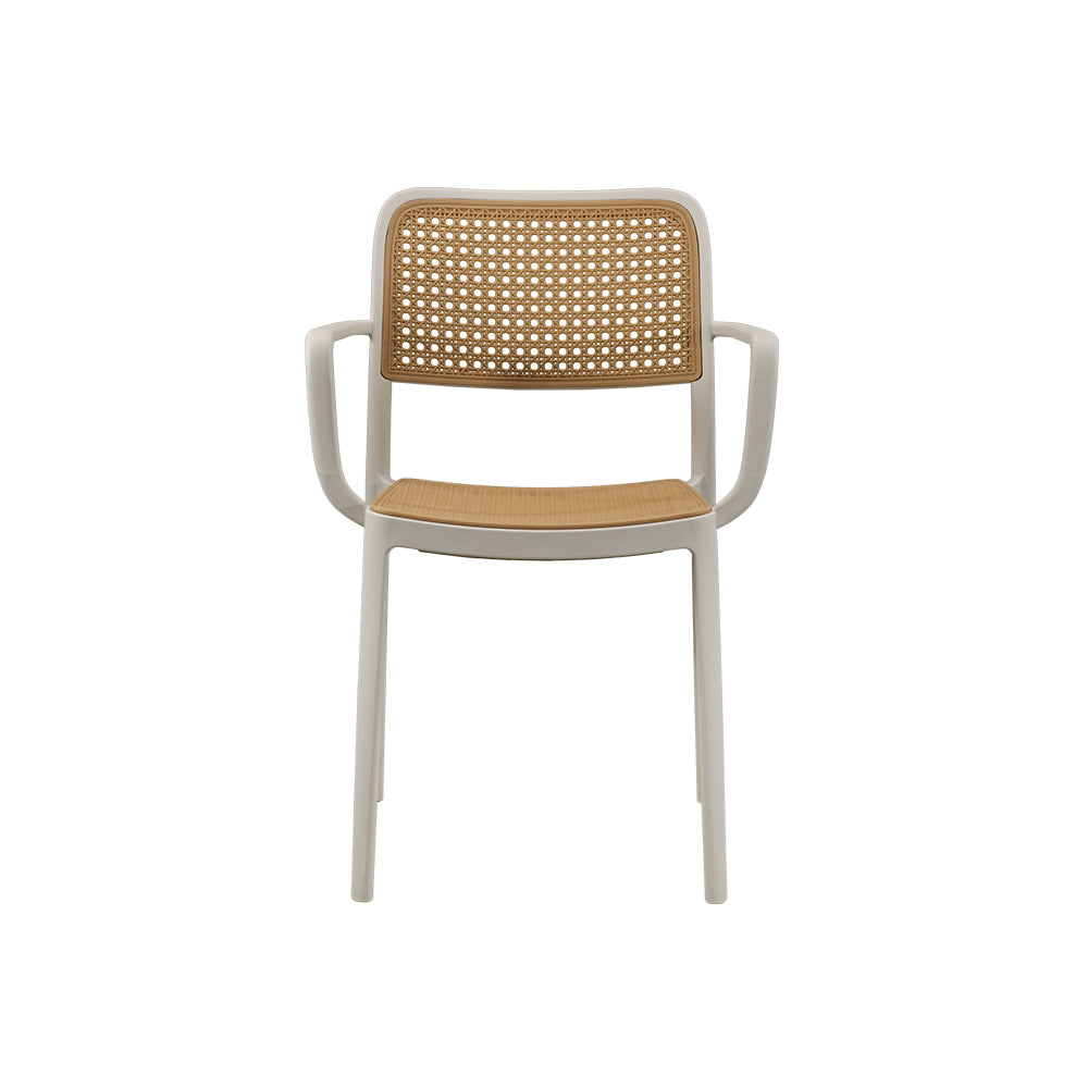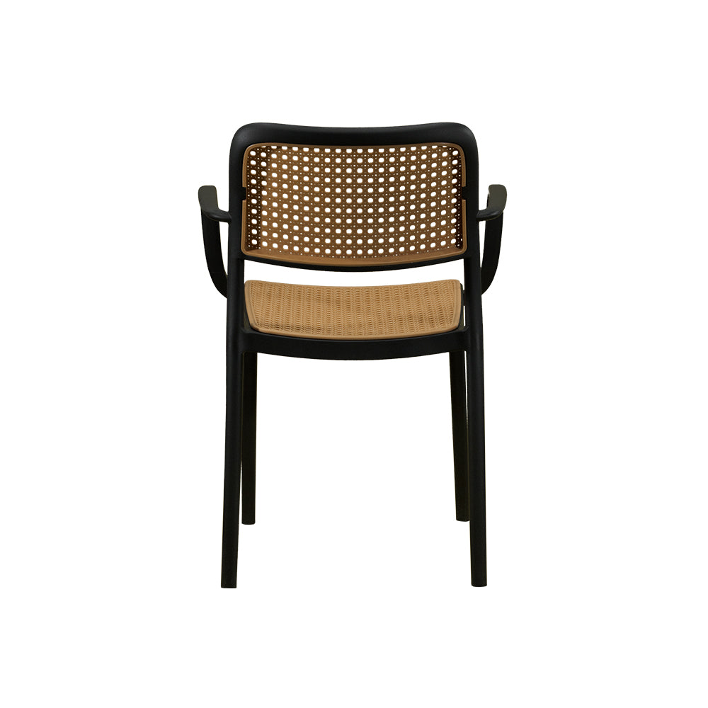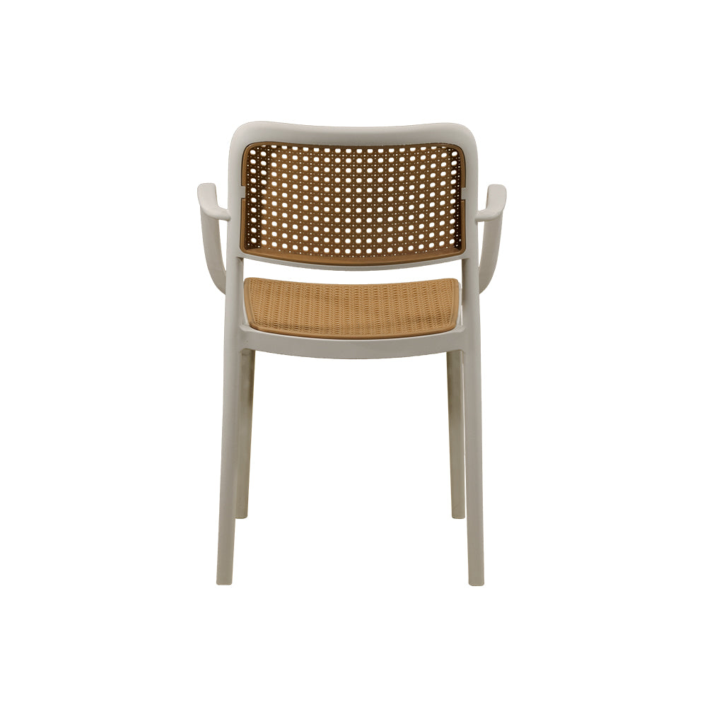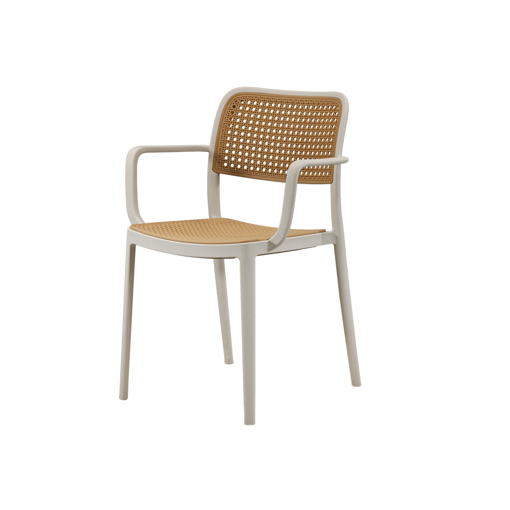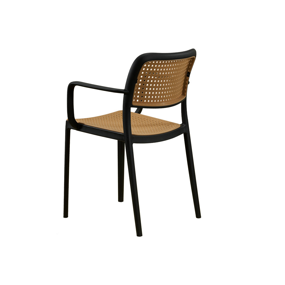 La Silla Fairuz combina practicidad y diseño contemporáneo en un modelo con antebrazo que asegura mayor comodidad. Fabricada en polipropileno de alta resistencia, está pensada para soportar las condiciones de intemperie sin perder estilo. Disponible en combinaciones beige con café y negro con café, se adapta fácilmente a terrazas, jardines o proyectos de hospitalidad modernos.