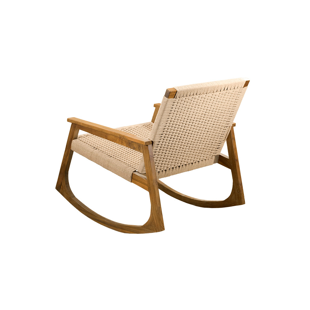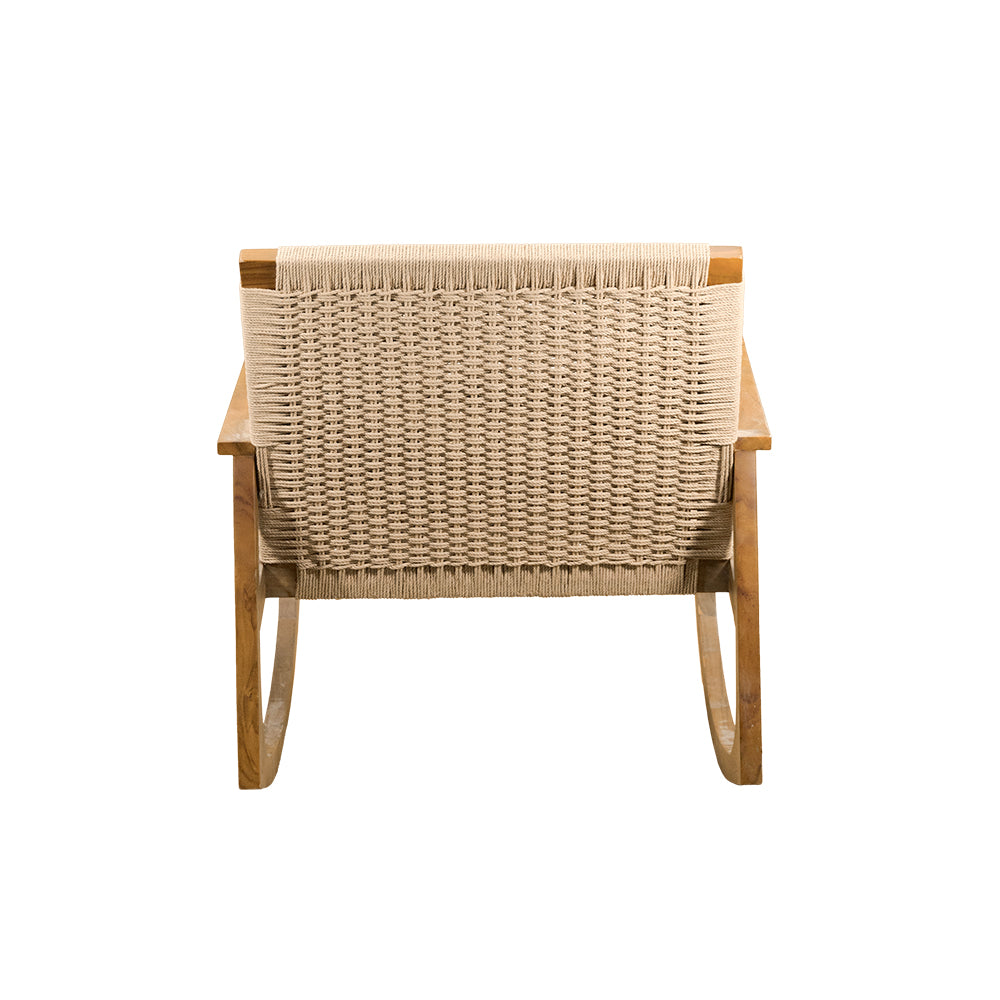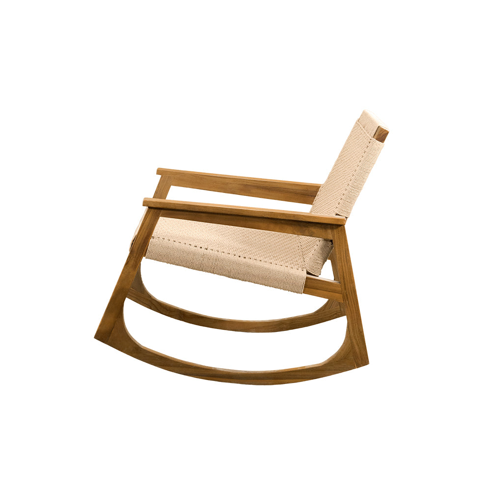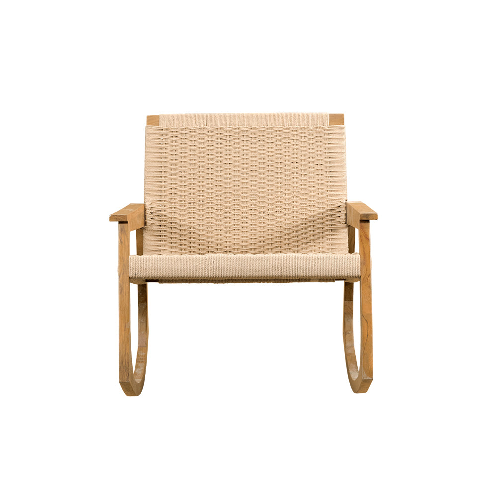Relajación con estilo natural. El Sillón Roland es una mecedora de terraza que combina la resistencia de la teca con el encanto del polyrattan en tono natural. Su diseño aporta confort y elegancia, ideal para disfrutar de momentos al aire libre en terrazas residenciales o proyectos hoteleros que buscan mobiliario acogedor y sofisticado.