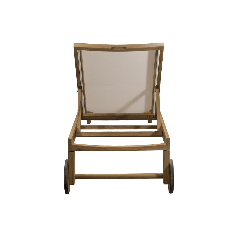 Comodidad y resistencia para exteriores. El Camastro Aria combina estructura de madera de acacia con tela de textileno color beige, ofreciendo un diseño elegante y duradero para uso en intemperie. Perfecto para terrazas, jardines o áreas de hotel que buscan relajación con estilo y funcionalidad.