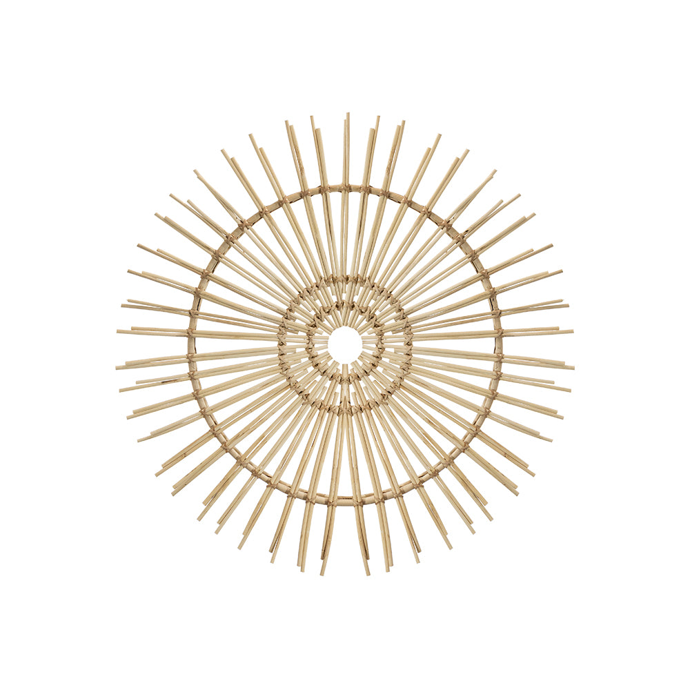 El Colgante Noria está elaborado en rattan natural, ideal para interiores, aportando textura y un toque artesanal a tus paredes. No apto para intemperie.