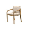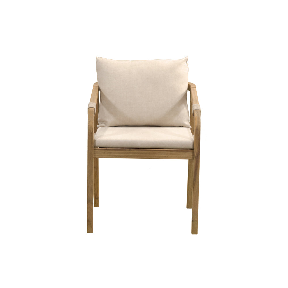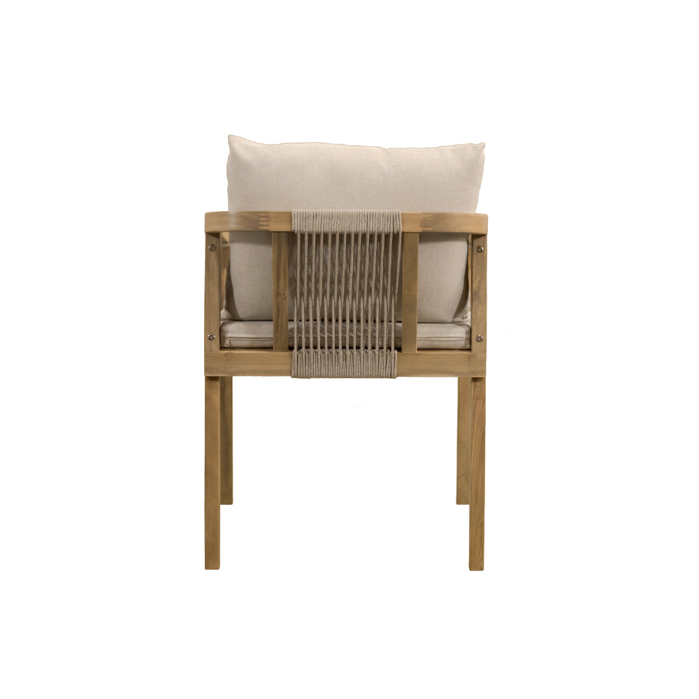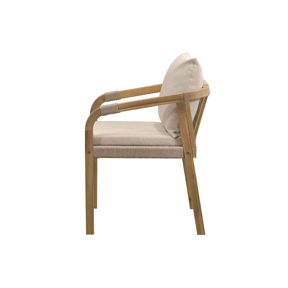 Diseño elegante y natural para terrazas. La Silla Miranda combina estructura de madera de acacia, tejido en cuerda y cojinería en asiento y respaldo, todo en un delicado tono beige que aporta calidez y estilo. Ideal para proyectos que buscan confort y un acabado sofisticado en espacios exteriores protegidos.
