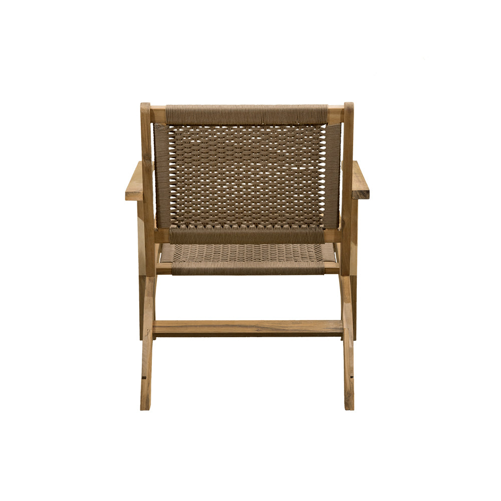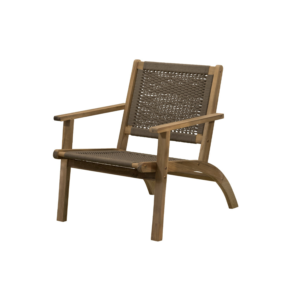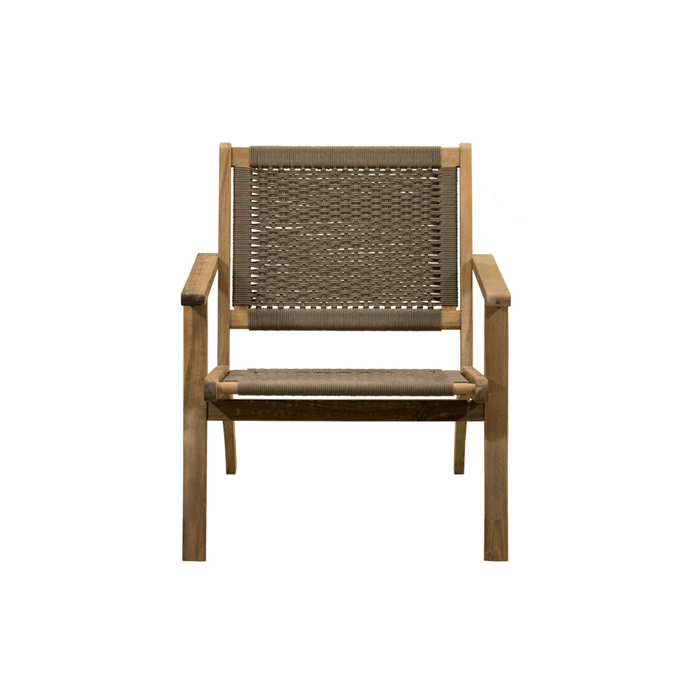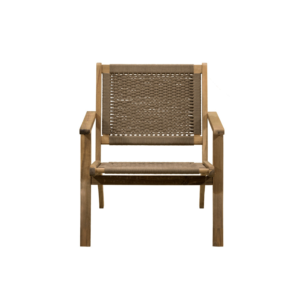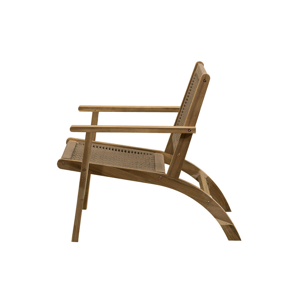 Calidez natural con un toque contemporáneo. El Sillón Noa combina la nobleza de la madera de acacia en su tono natural con el tejido en cuerda beige y café, logrando un contraste armónico y elegante. Perfecto para terrazas cubiertas, aporta comodidad y estilo a proyectos residenciales u hoteleros que buscan un ambiente acogedor.