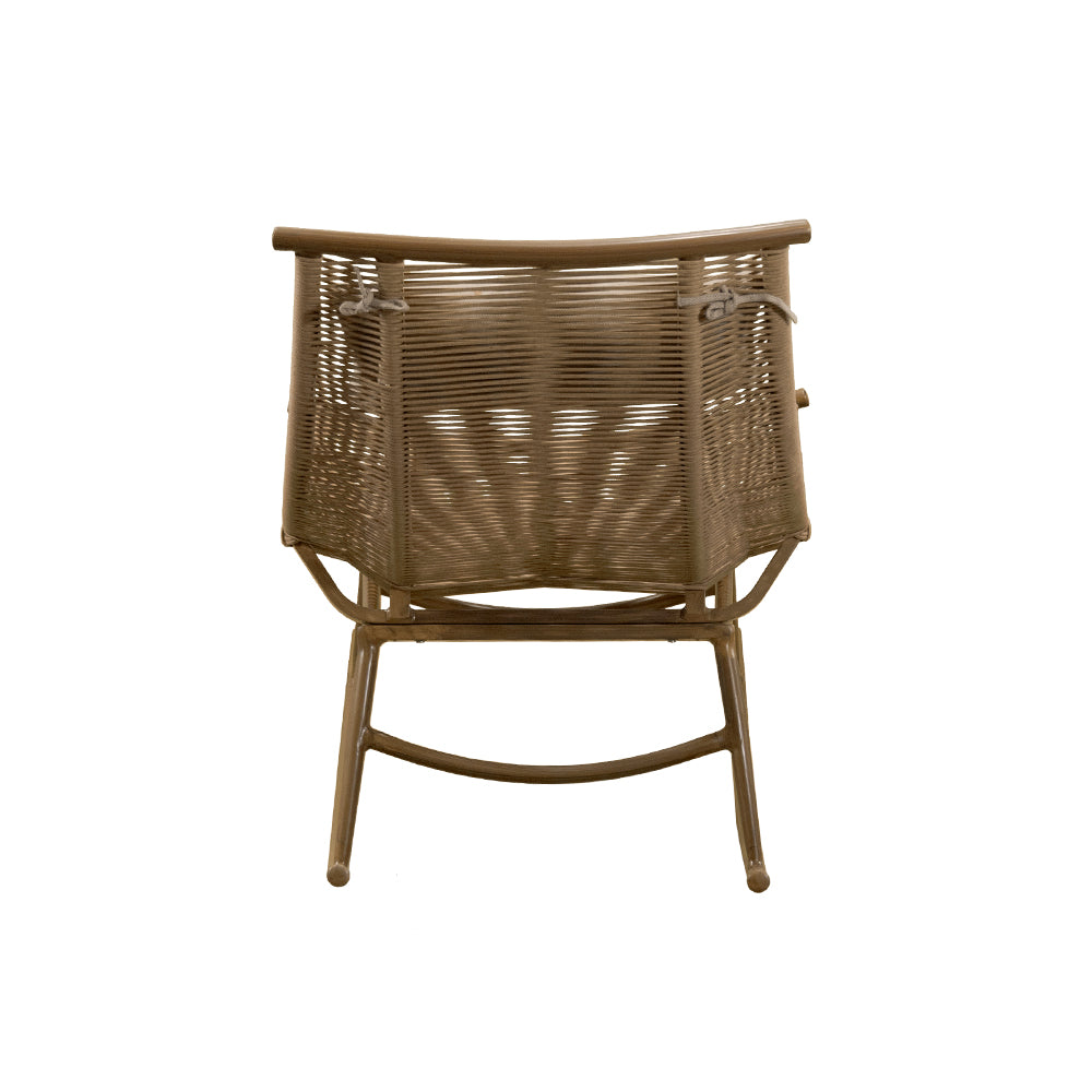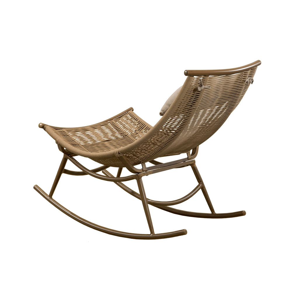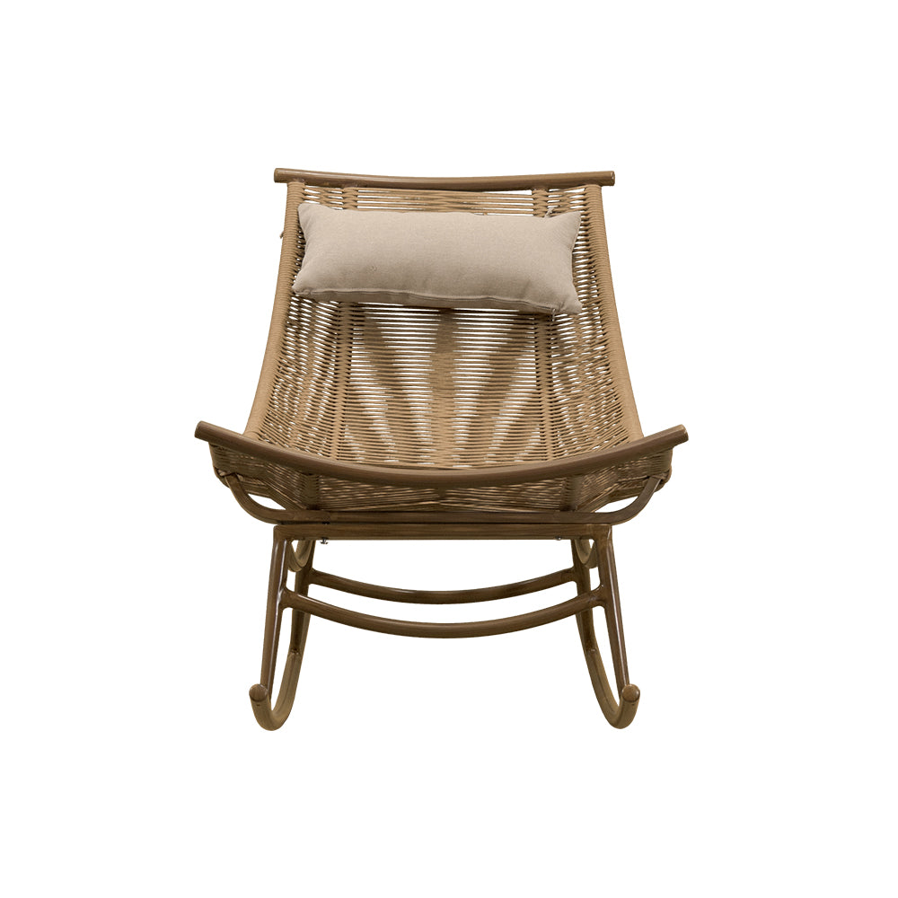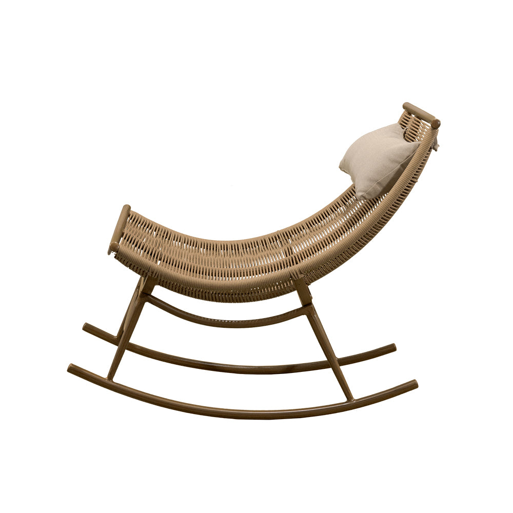 Confort y movimiento en un diseño atemporal. El Sillón Morrigan es una mecedora de exterior fabricada en aluminio con tejido de cuerda color beige, resistente y elegante. Diseñado para uso en intemperie, brinda una experiencia de descanso única, perfecta para terrazas, jardines o áreas de relajación en proyectos hoteleros.